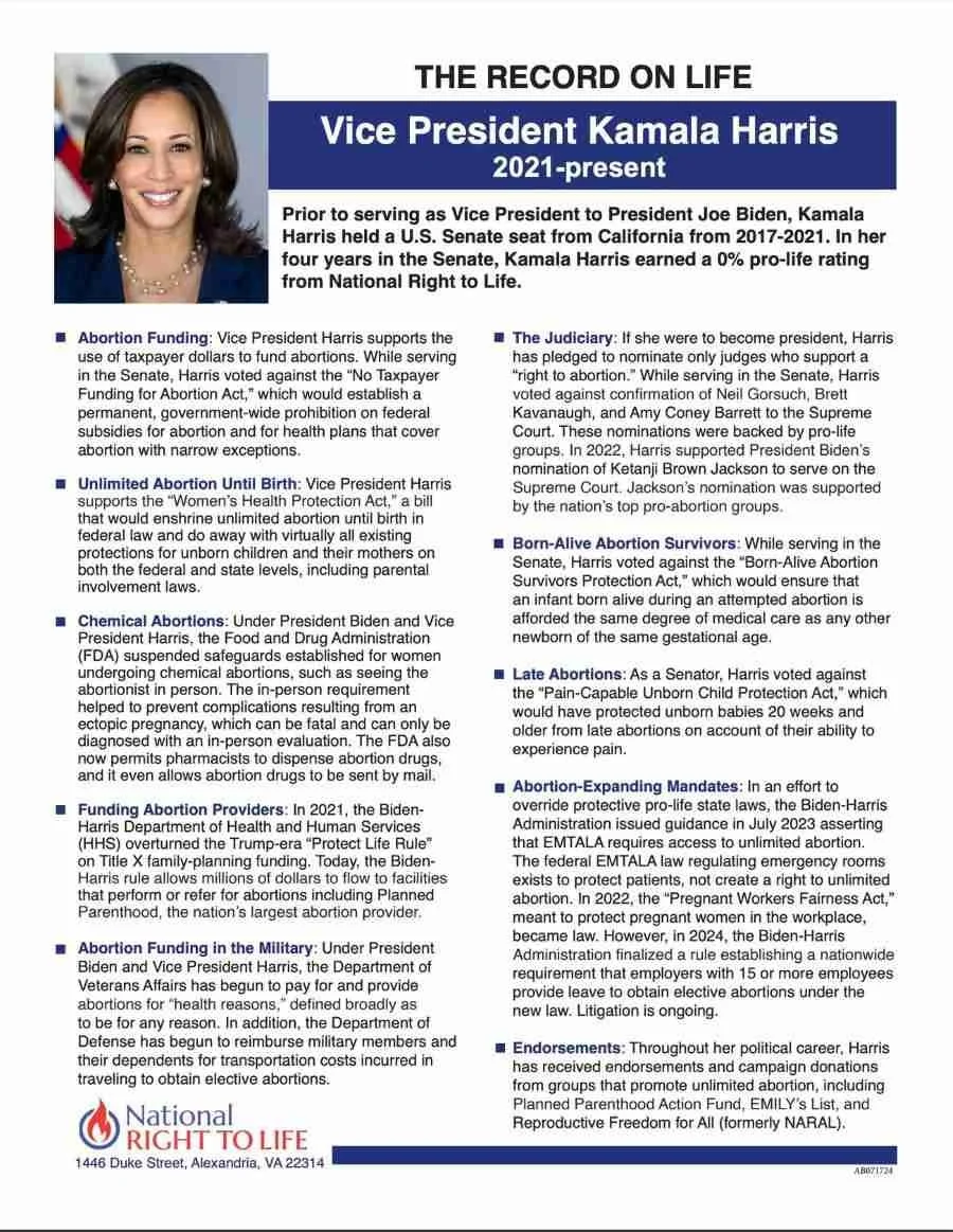 Vice President Harris served in the U.S. Senate from 2017 – 2021, and during that time she had a zero percent pro-life voting record. Zero percent of the time she found the compassion to protect unborn children and their mothers! Instead, she voted for abortion without limits, taxpayer funding of abortions, late-term abortions, and abortions in our military.
